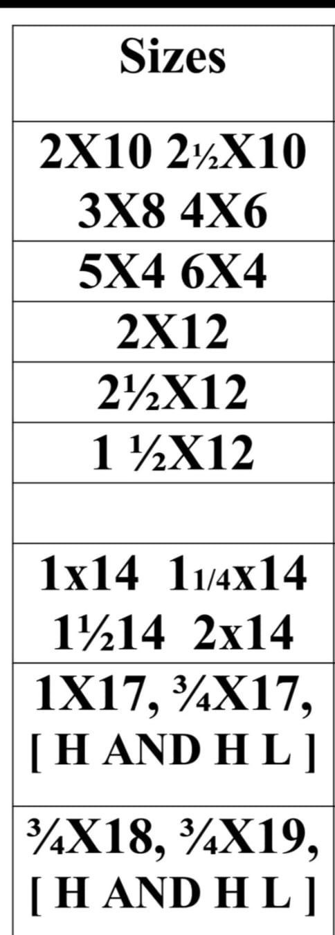2x8 2½x10 3"x8 1"x14 1¼x14 1½x14 2x14